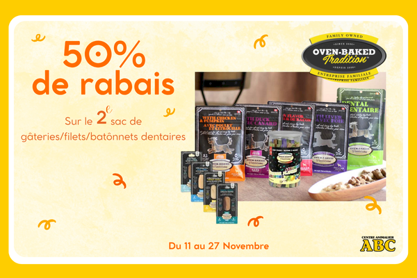 À l’achat de gâteries, d’un filet ou d’un sac de batonnets dentaires Oven-Baked Tradition.