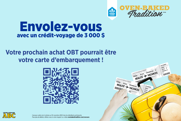 Chaque achat d’un produit Oven-Baked Tradition vous donne automatiquement une chance de remporter un crédit voyage de 3 000 $!
