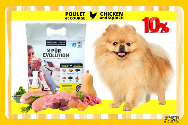 ✅10% de rabais sur la recette crue au Poulet & Courge de Pur Évolution, pour chien.