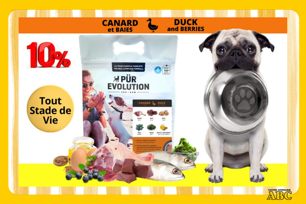 ✅10% de rabais sur la recette crue au Canard de Pur Évolution, pour chien.